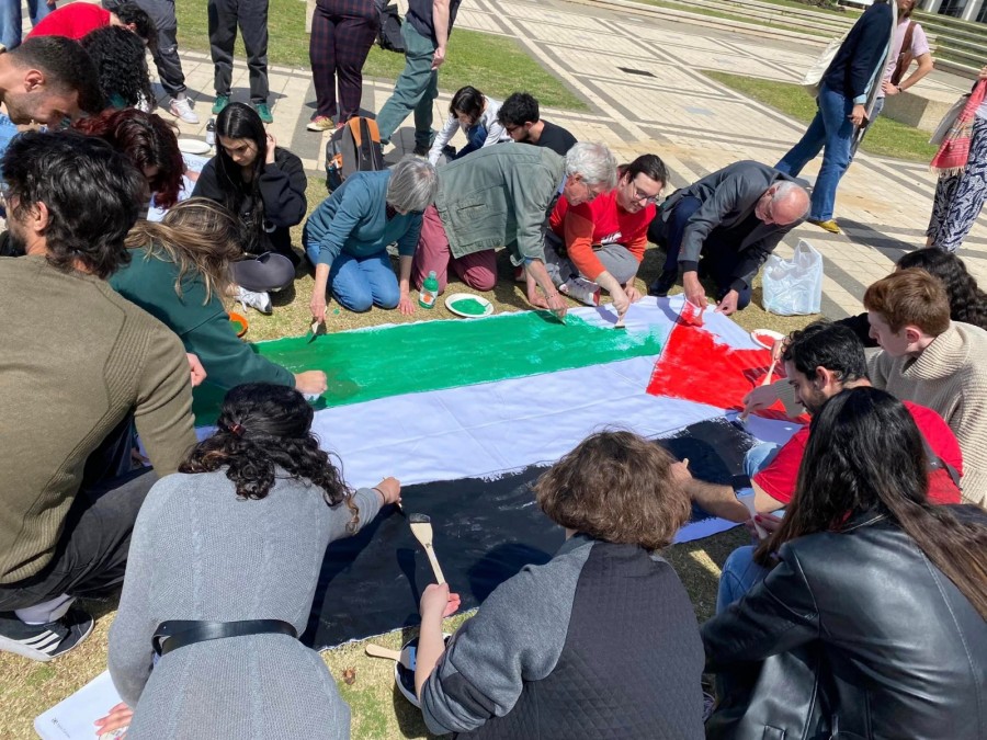 أقامت الجبهة الطلابية اليوم نشاط رسم العلم الفلسطيني في جامعة تل ابيب، في رسالة متحدّية لقانون منع رفع العلم الفلسطيني في الجامعات الاسرائيلية الذي ينوي الائتلاف الحكومي سنّه، بمشاركة عشرات الطلاب والمحاضرين العرب واليهود، وذلك رغم حظر إدارة الجامعة للفعالية داخل الحرم الجامعي. وشارك الطلاب والمحاضرين نشاطهم، رئيس الجبهة، الرفيق عصام مخول.