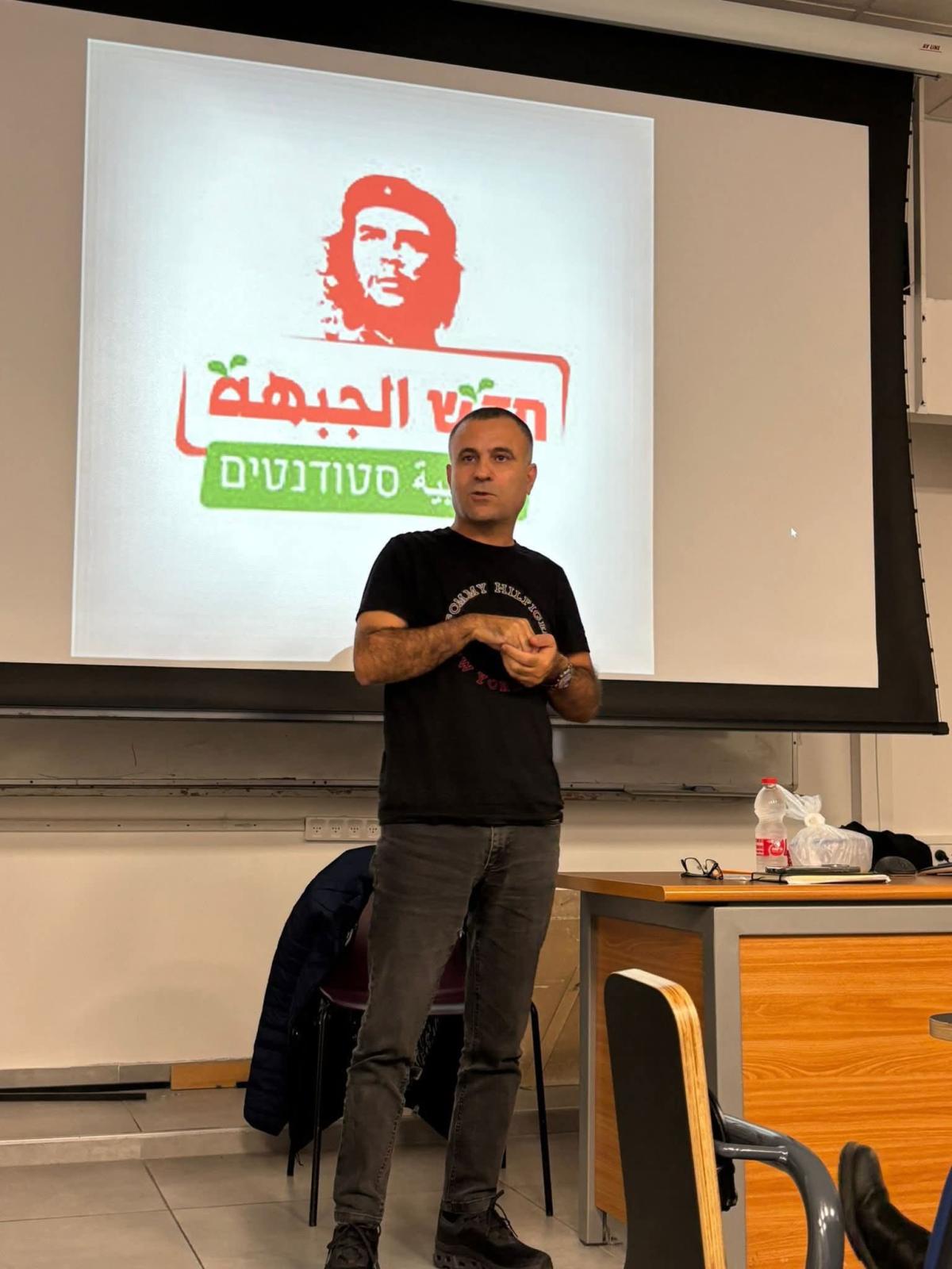 كما ألقى الرفيق صالح إغبارية، مركّز الدائرة الطلابية، كلمة استعرض فيها عمل الجبهة خلال فترة الحرب، مشددًا على الدور الكبير والمهم لفرع تل أبيب في مواجهة سياسات الترهيب والقمع، ومتطرقًا إلى أهمية ودور الحركة الطلابية في النضال الوطني الشعبي والجماهيري.
