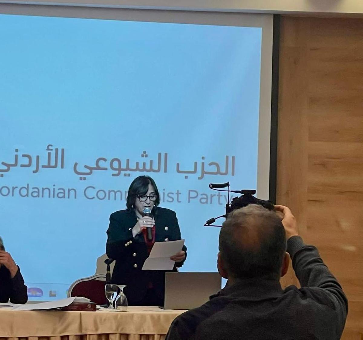 وقدّمت الرفيقة عايدة نصر الله من لبنان، ممثلة المنطقة العربية في اتحاد النساء الديمقراطي العالمي، كلمة شكرت فيها الحزب الشيوعي الأردني على استضافته الفعالية الإقليمية، مشددة على مواصلة النضال النسوي الديمقراطي من أجل حرية الشعوب وحرية المرأة في المنطقة والعالم. ووجّهت التحية إلى النساء المناضلات في العالم، وبشكل خاص في غزة.